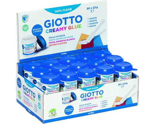 Colla bianca in pasta. Mini formato ideale per l uso a scuola. Non sporca grazie alla speciale spatola inserita nel barattolo che ne facilita la stesura. Ideale per incollare carta, foto, etichette.