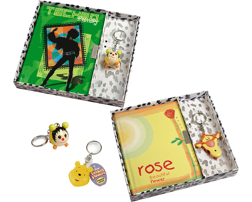 Set regalo completo di diario ricordi a pagine profumate con lucchetto e portachiavi.